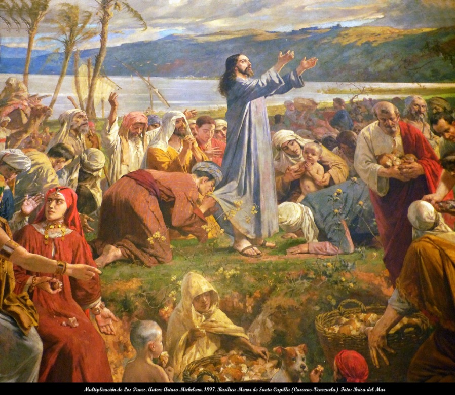En aquella dirección apareció un campo irregular y quebrado en el que venían algunas palmeras torcidas y casi secas, agitadas por el viento; hacia la izquierda, y en dirección de las palmeras, se notaba la bella ensenada de un lago de plomizas aguas; a orillas del lago unas colinas cubiertas de hierbas y de no muy grande elevación, y, por fin, más allá y por encima de las colinas el cielo azul con nubes acumuladas, mensajeras de próximas borrascas. Una gran multitud de hombres, mujeres y niños se encontraba en aquel sitio y le daba el aspecto de un campamento. Toda aquella muchedumbre parecía presa de un entusiasmo indescriptible, como si hubieran sido testigos de un acontecimiento nunca visto en el mundo; como que lo comentaban y discutían con vehemencia, y a veces llagaba a mis oídos el ruido de una inmensa aclamación semejante al ruido del mar durante una tempestad. Unos cuantos de los actores de aquella escena estaban afanados recogiendo unos objetos que, ciertamente, eran pedazos de pan y restos de pescado, los cuales iban colocando cuidadosamente en cestos. De pie sobre una pequeña elevación del terreno y dominando aquel espectáculo estaba Él, resplandeciente en su divinidad y con las manos omnipotentes levantadas al cielo en actitud de dar gracias.